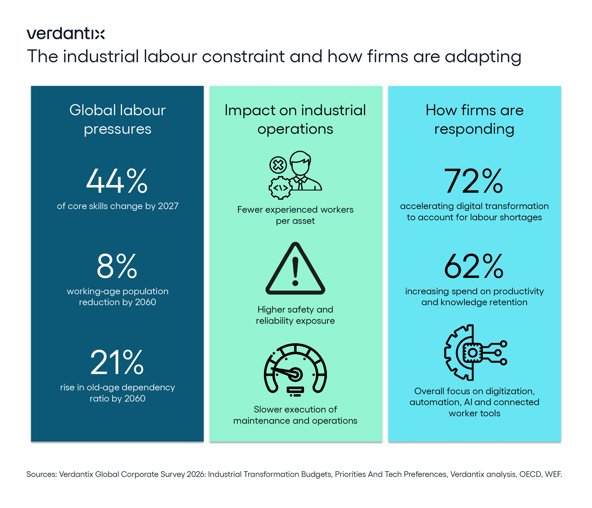 Verdantix survey data show that these labour dynamics are directly influencing industrial investment priorities. Over 70% of firms identify the lack of skilled workers due to an aging and retiring workforce as a significant driver of digital transformation in plant operations. At the same time, more than 60% of organizations expect to increase spending on workforce productivity and knowledge retention initiatives over the next 12 months. This reflects a shift away from short-term hiring responses toward longer-term structural mitigation strategies (see below).